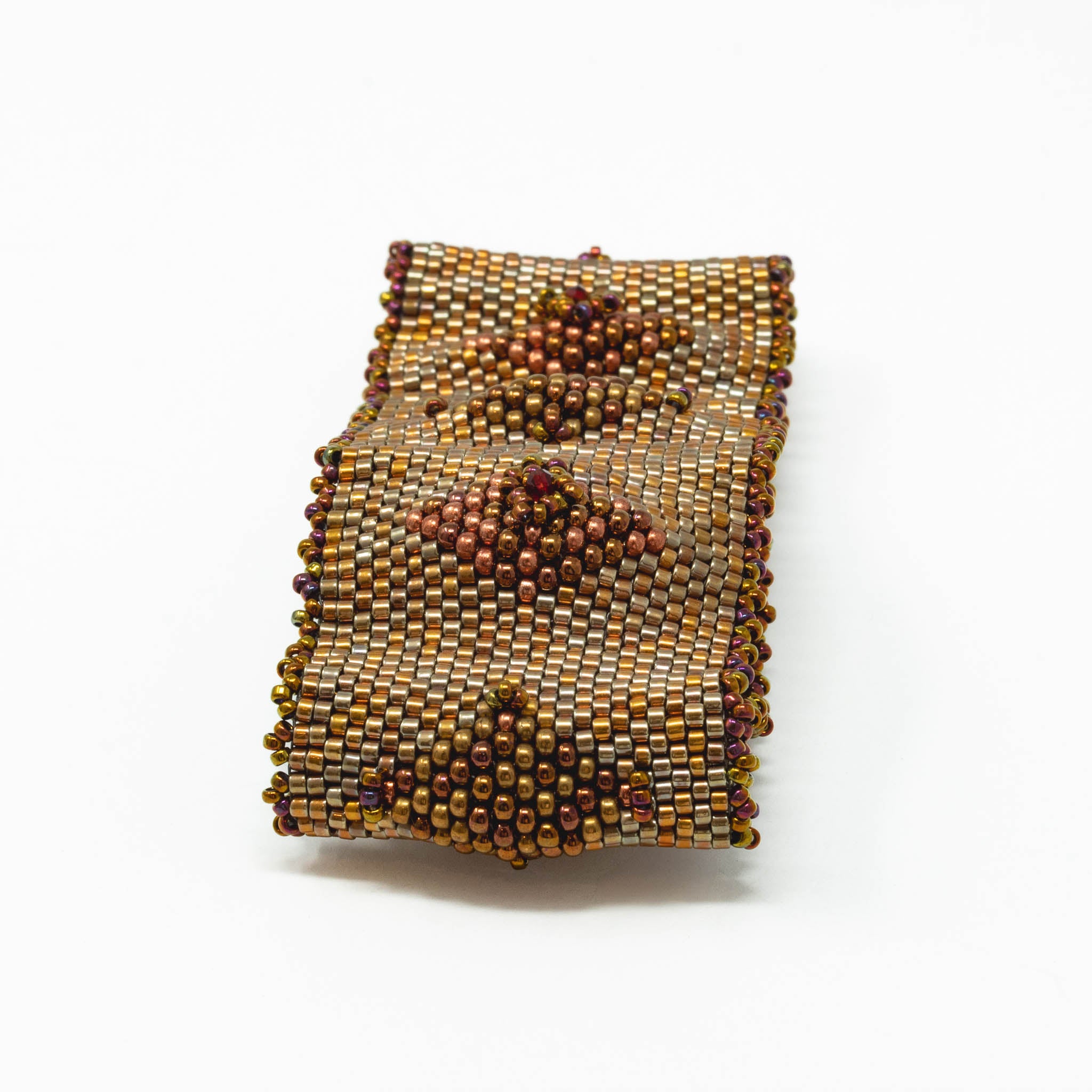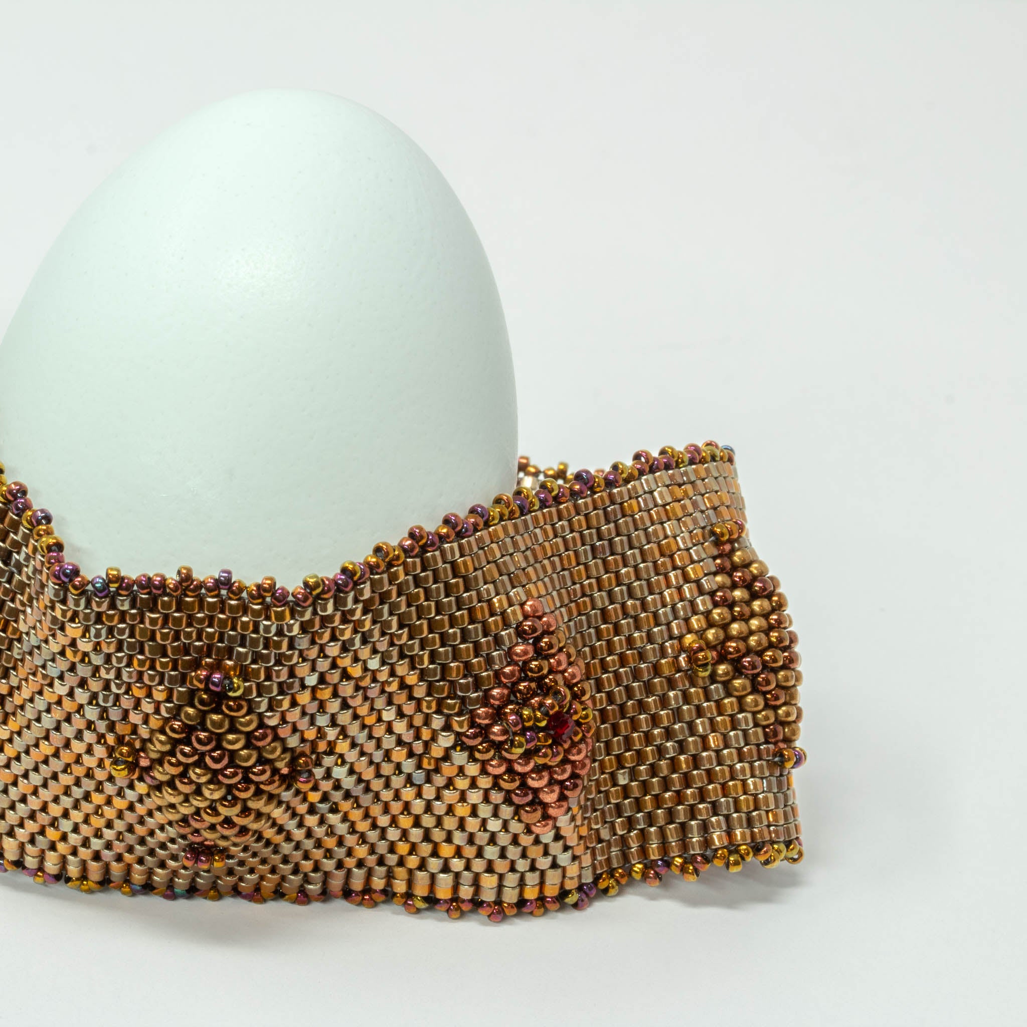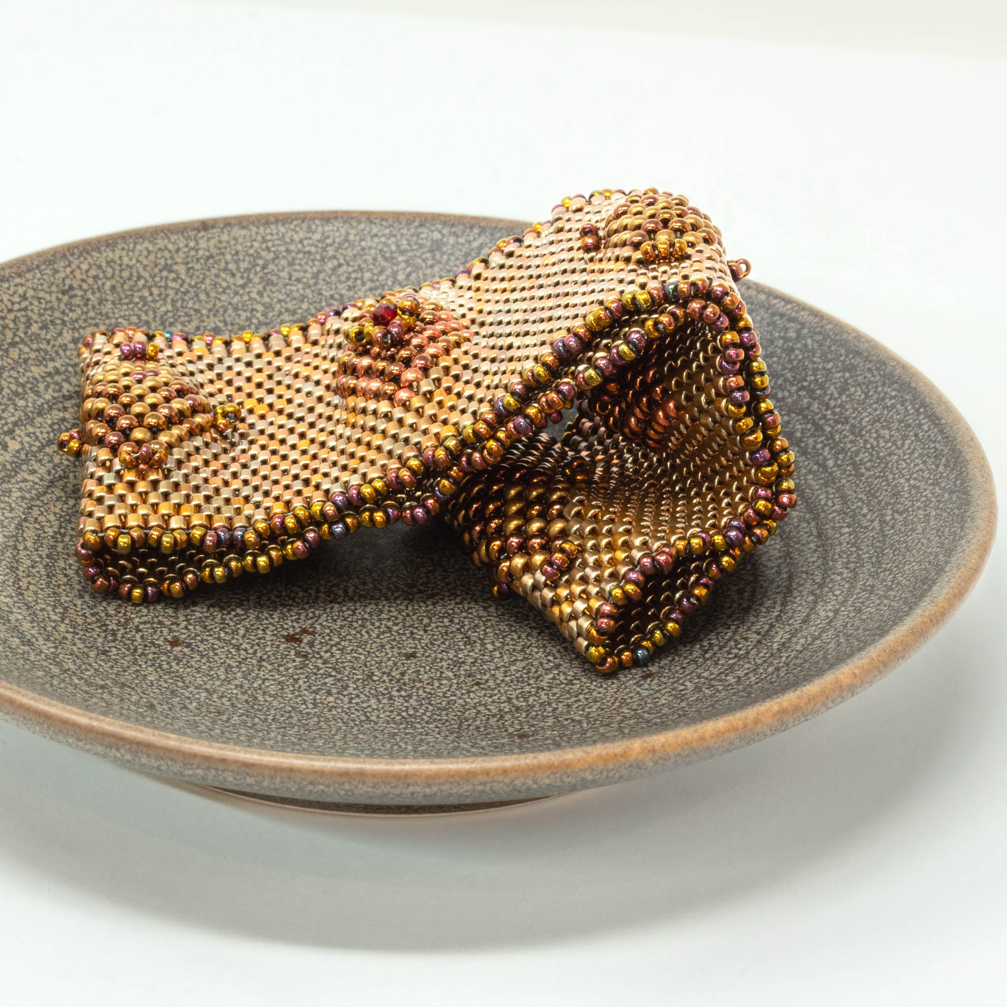 Our hand woven bead cuff bracelet uses 24kt orange gold plated Japanese glass beads and tiny sparkling Swarovski crystals.  With the look and feel of luxurious fabric, the bracelet is lightweight with a hint of sparkle at the center of every other raised diamond.  What a comfortable to wear and unique accessory to add to your look!  Make this a gift for you!
