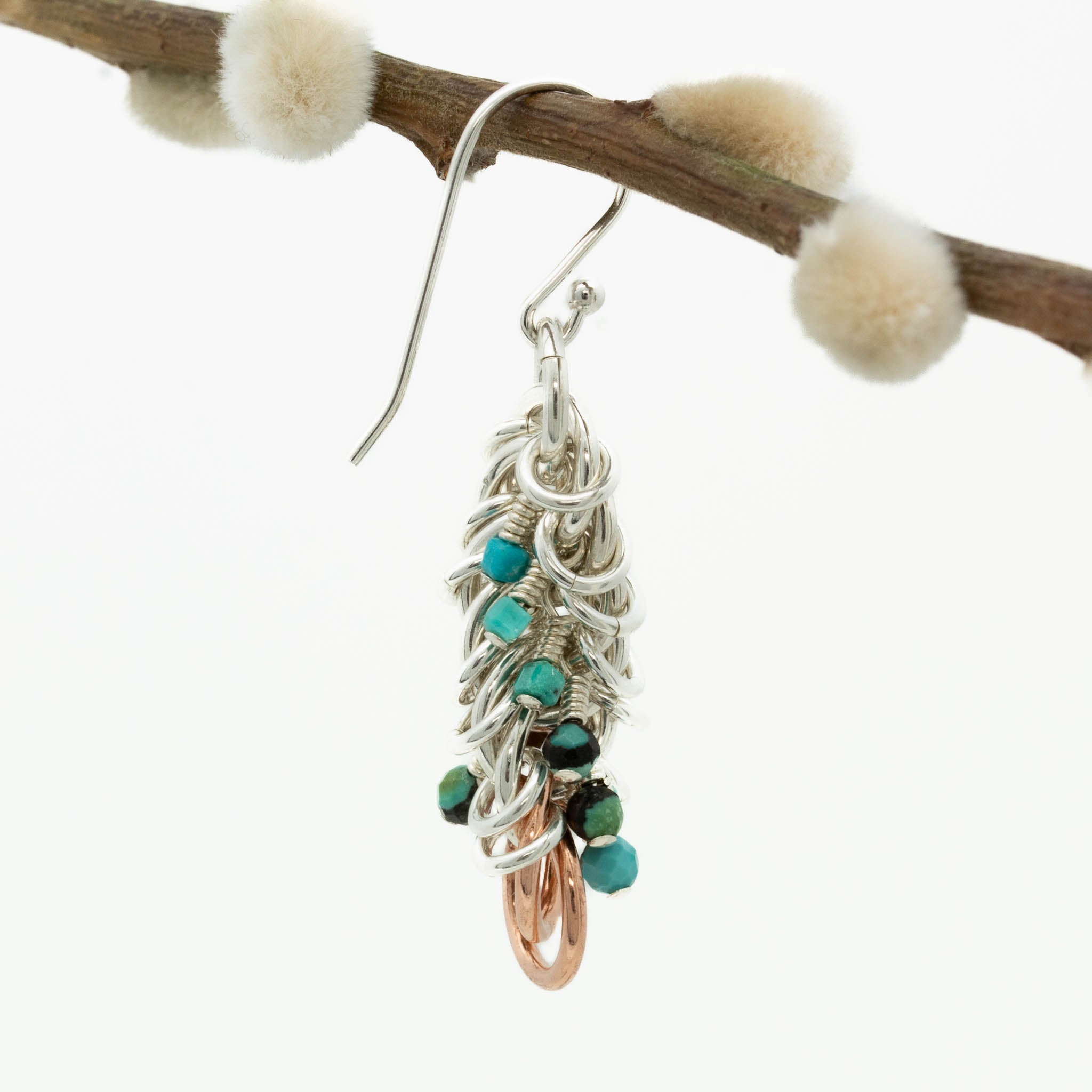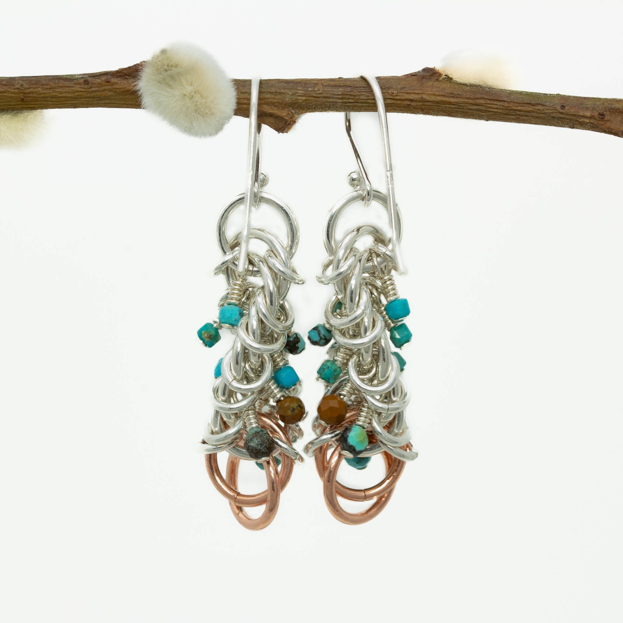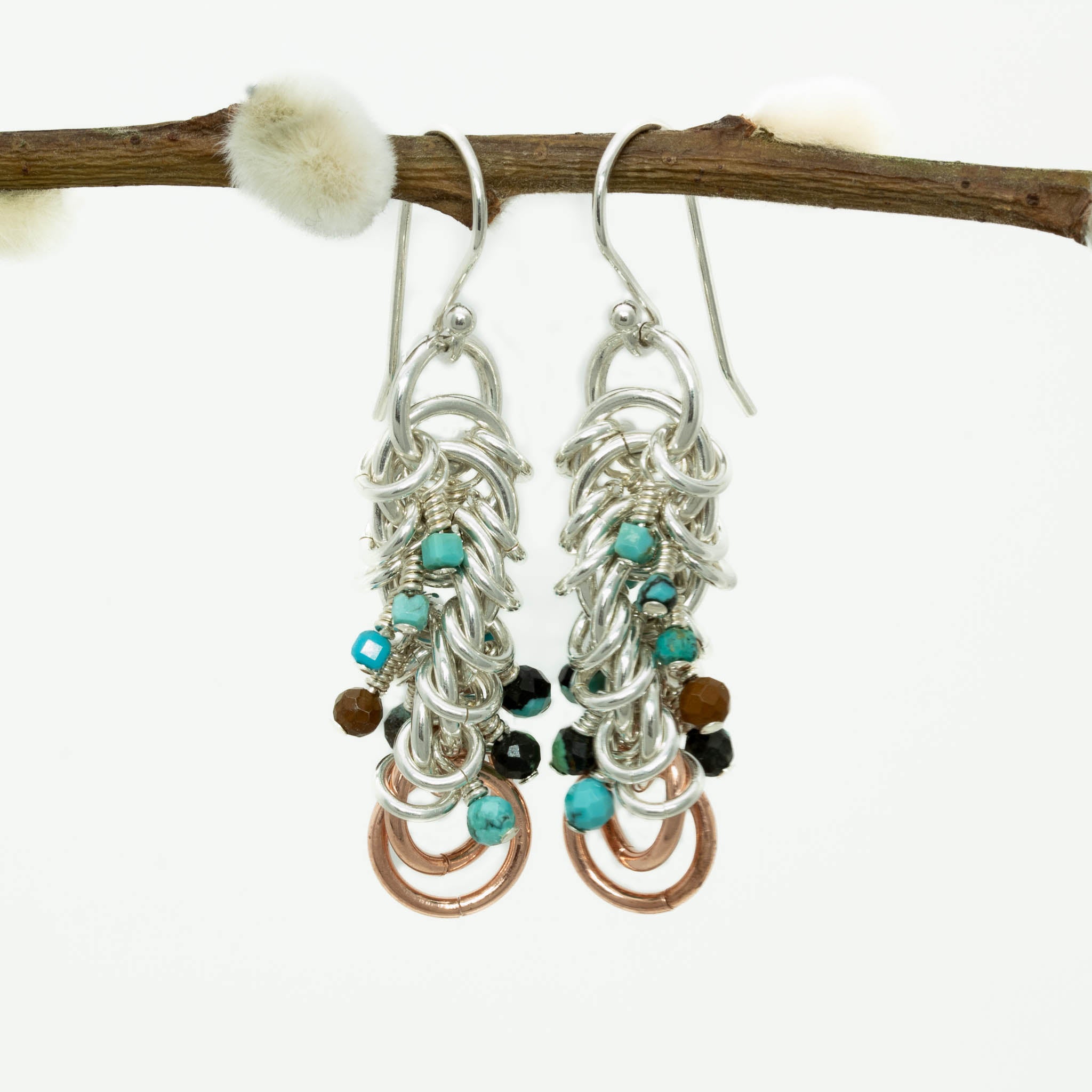The texture of Locked Twist Spiral chainmaille is hard to resist with these earrings. Turquoise gemstones always work well with sterling silver and they are no exception here. Copper rings anchor the design sealing the deal for a unique look. It is ALL you!