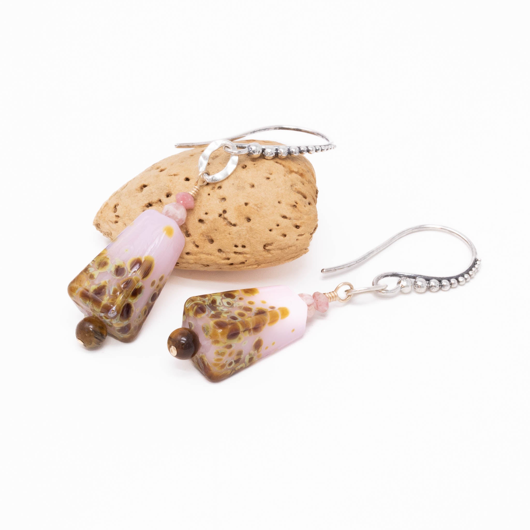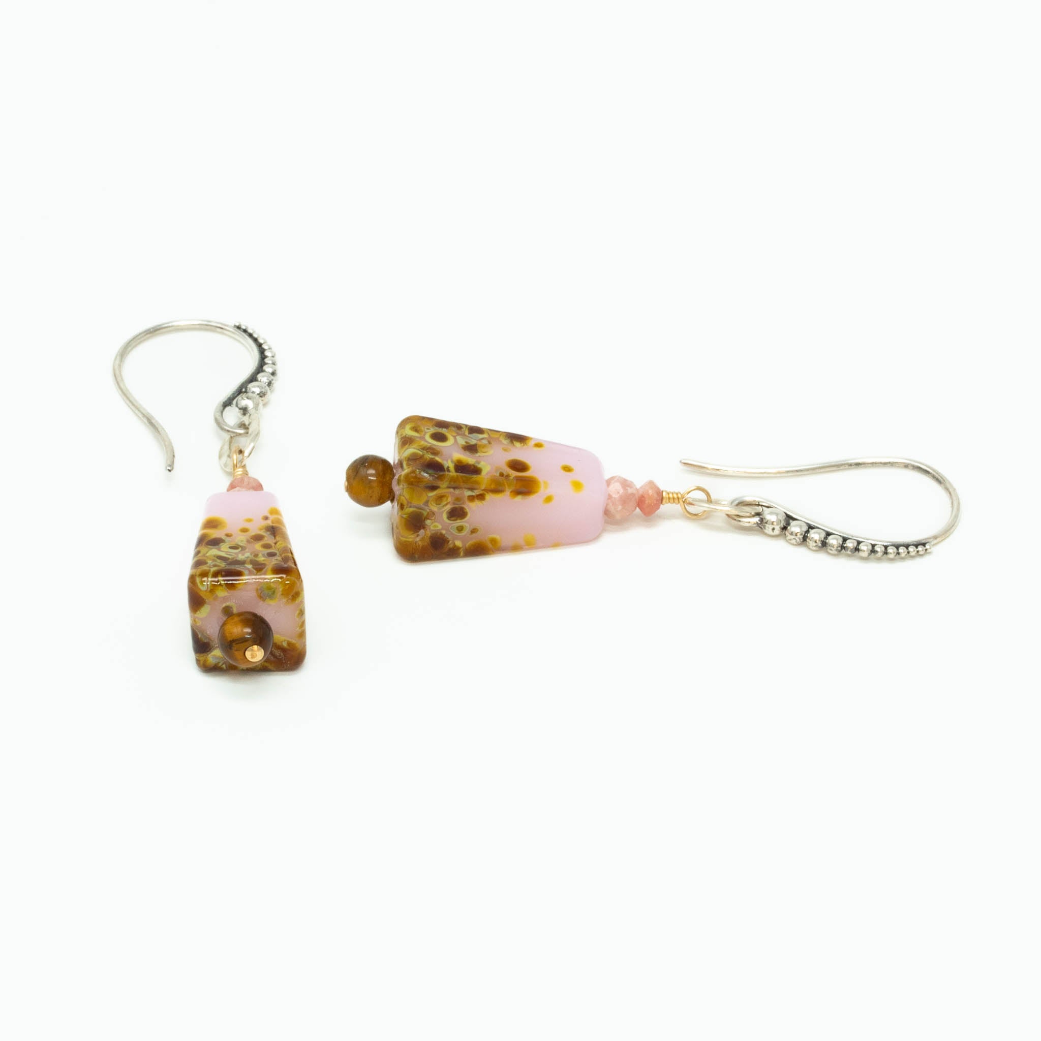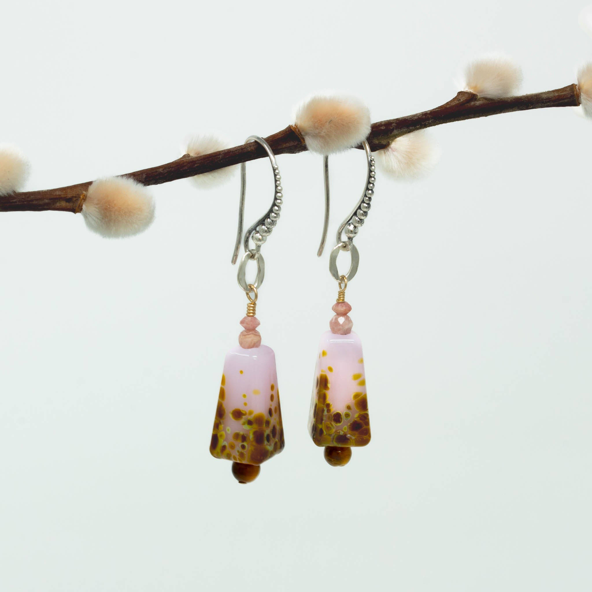 Our pink artist glass lampwork bead earrings are just what you were looking for!  Hand selected for cut, size and color, rhodocrhrosite gemstones at the top of the glass bead are a perfect match.  Round smooth tiger's eye gemstone beads anchor each earring.  Very pretty just for you!  Adorn yourself uniquely!