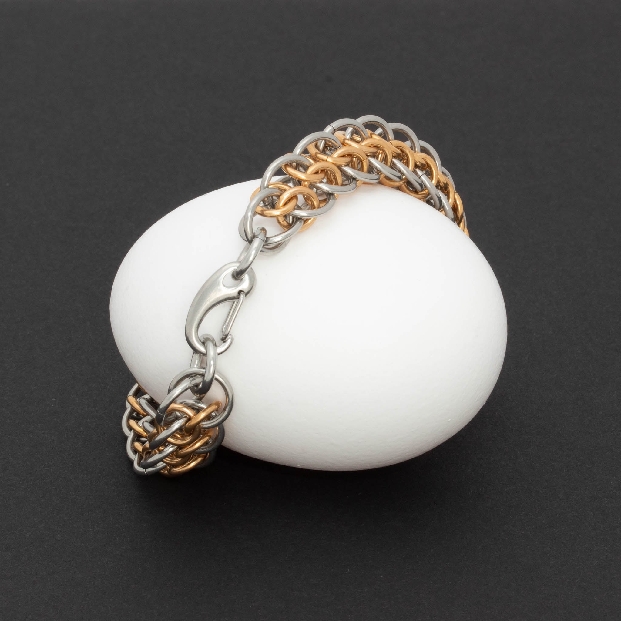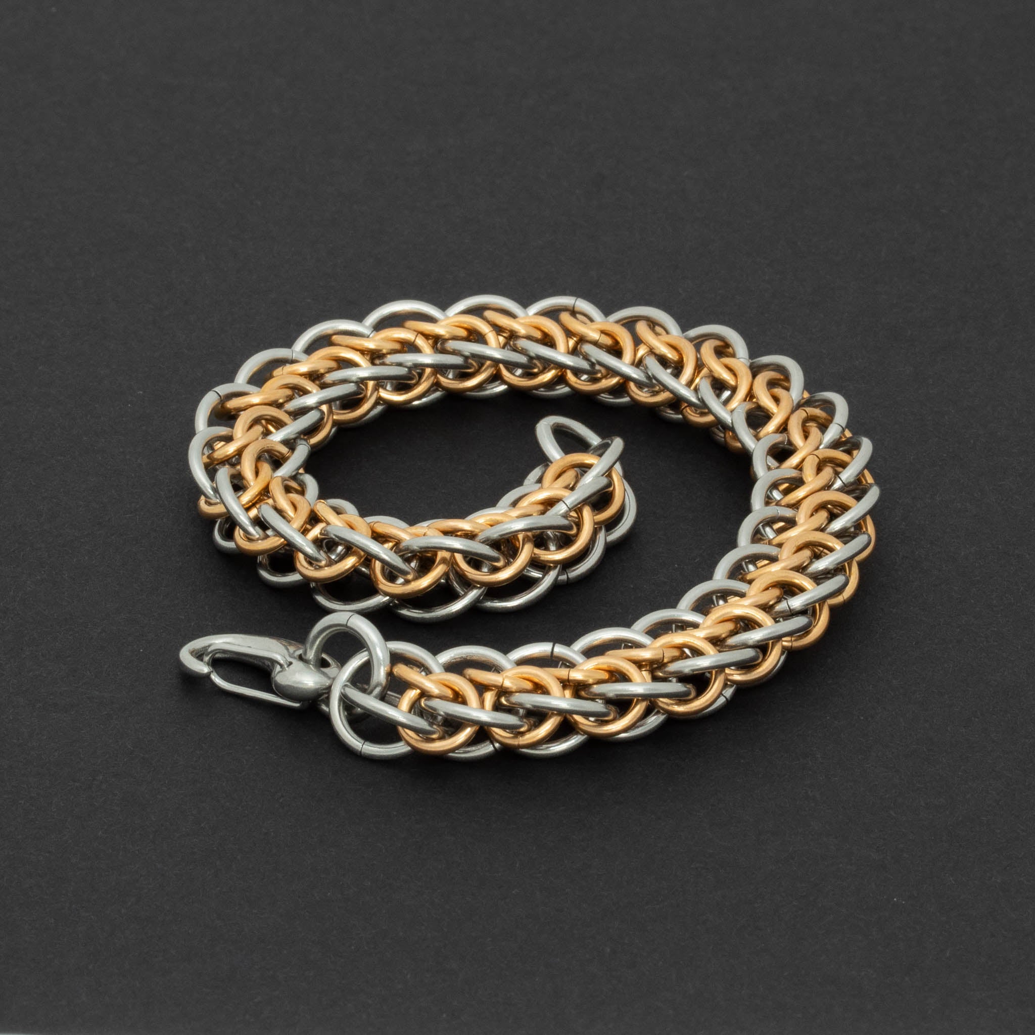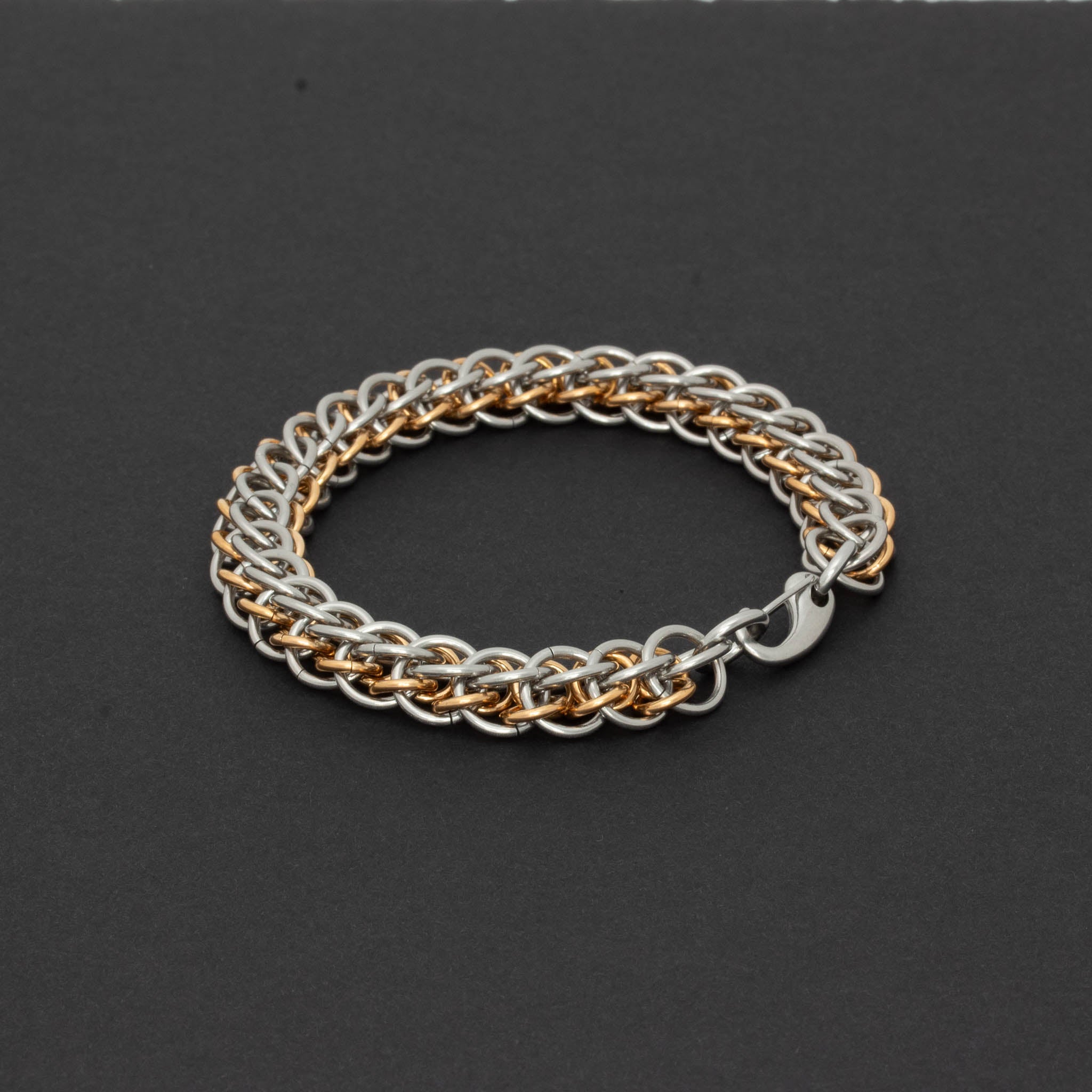 Slow Worm Chainmaille Weave is especially beautiful when woven in two colors!  Stainless steel and polished bronze rings accentuate this unique weave and bring it to life.  Chainmaille is always stylish, and can be worn for any occasion while putting a finishing touch on your most fashionable outfit.  The stainless steel hinge clasp is easy to open, is self-closing, and very secure.  This bracelet is sure to look perfect on your wrist.