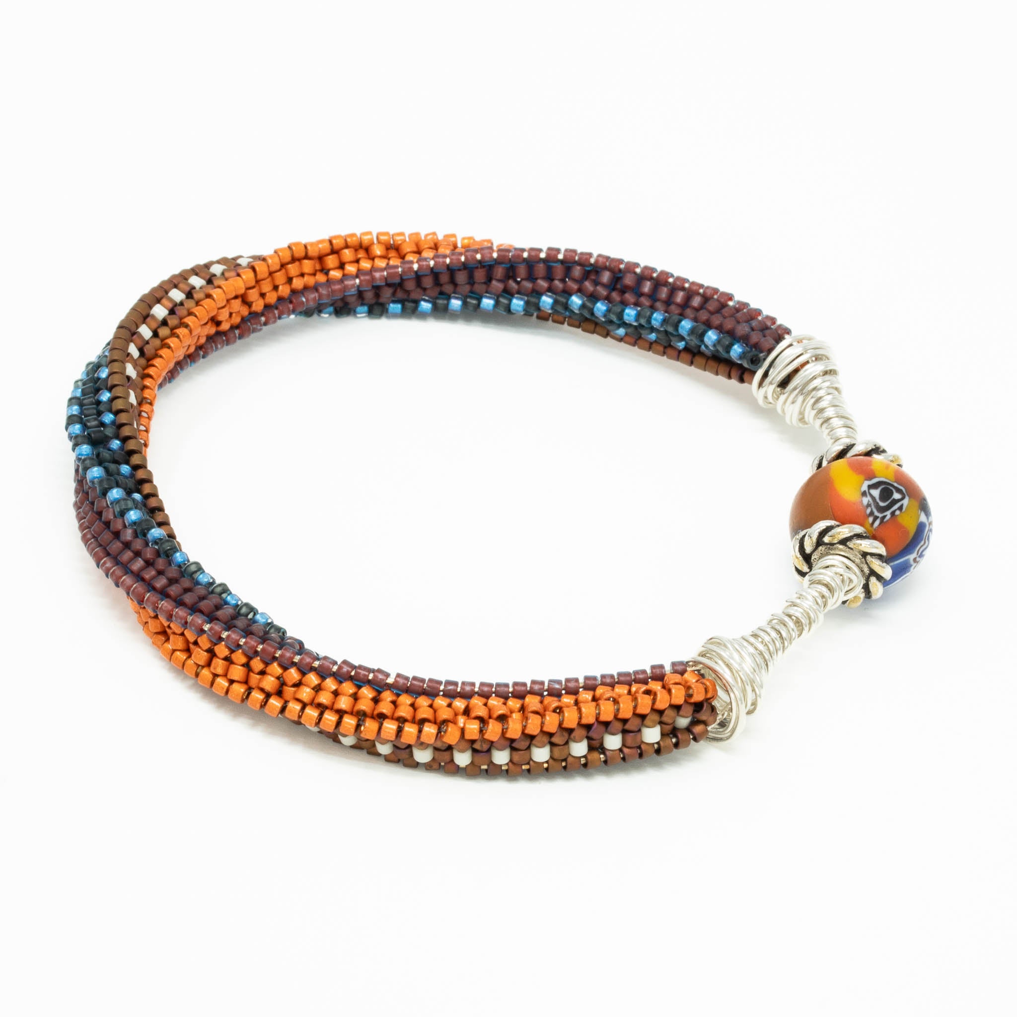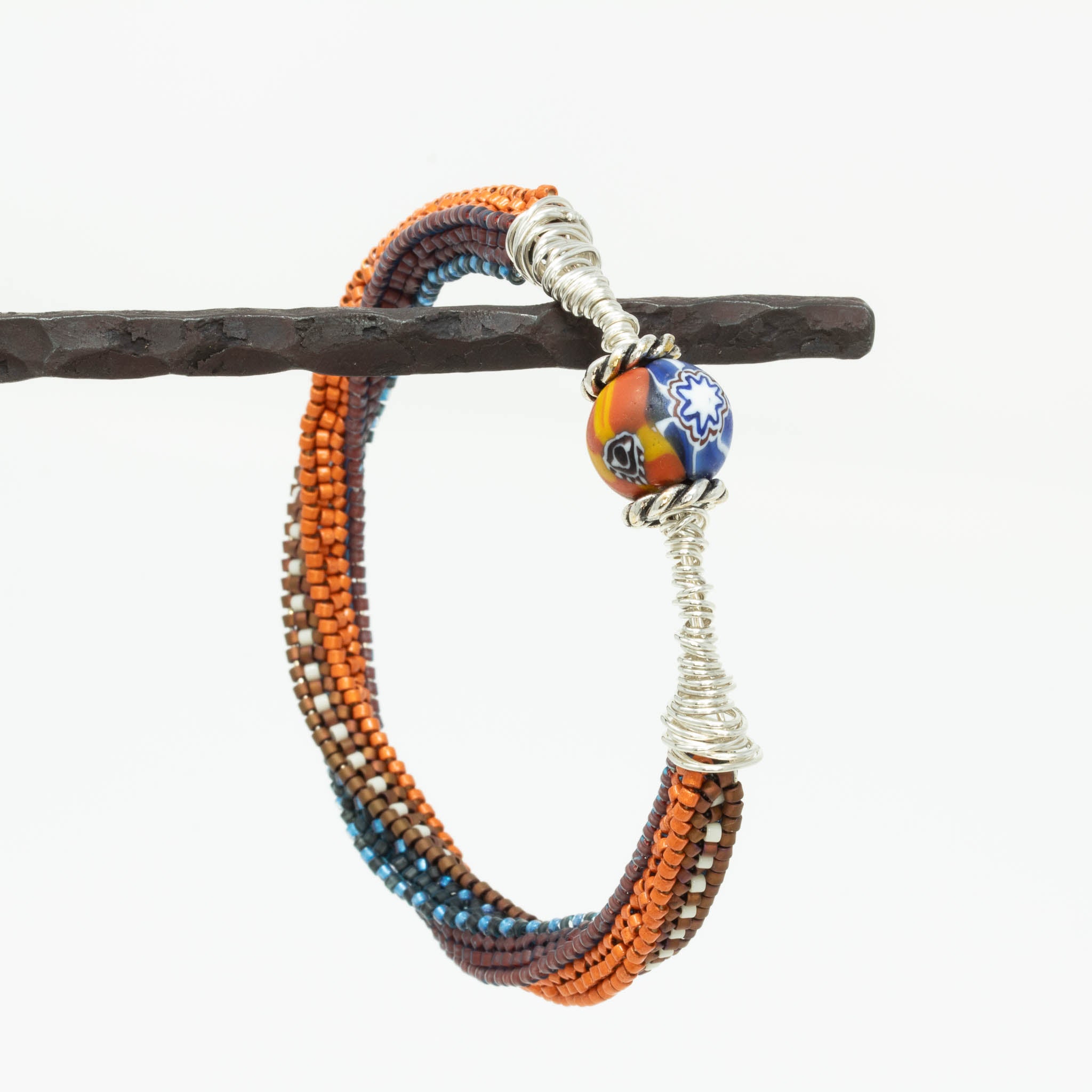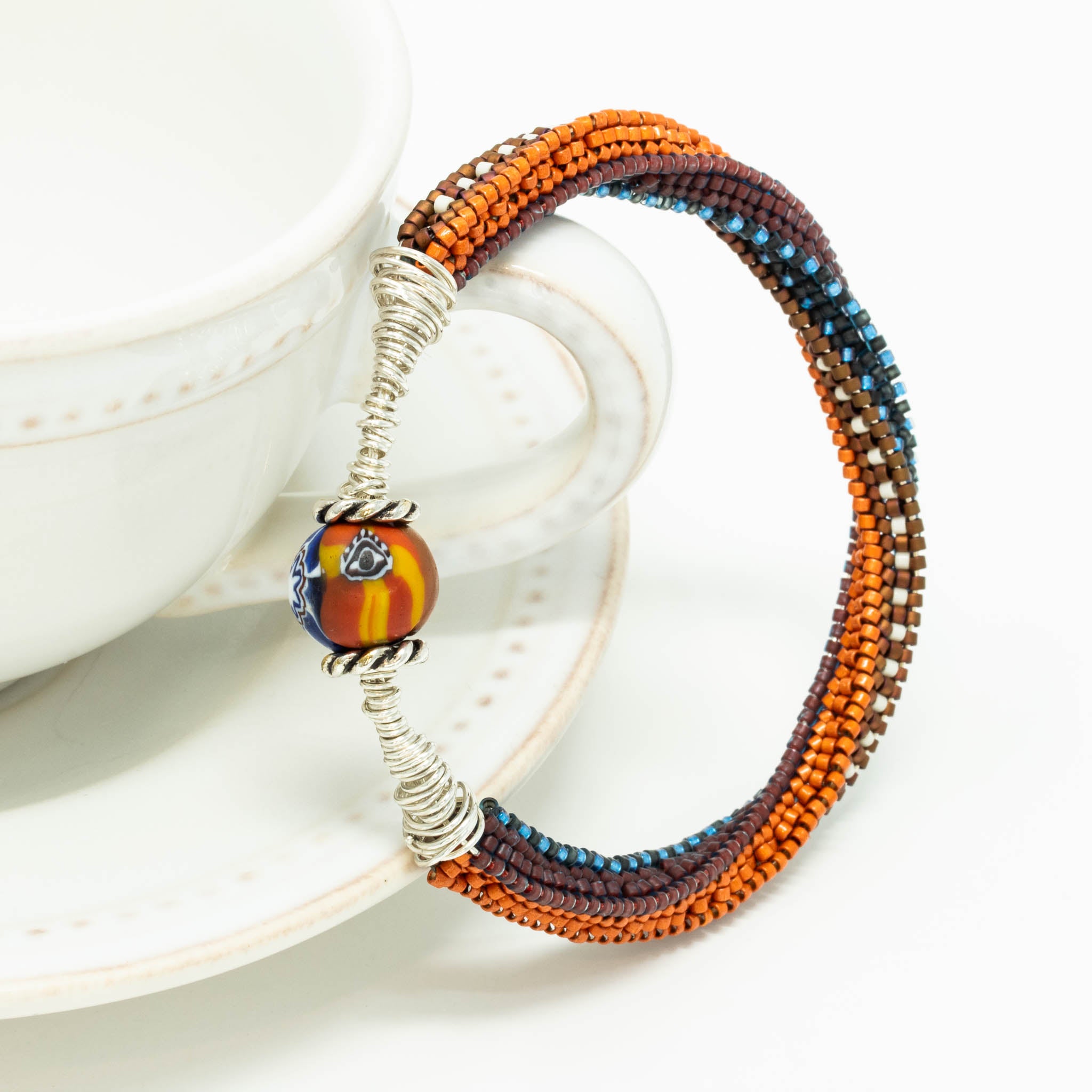 Our woven beaded bangle bracelet is a "twist" on the African Zulu Square Tube weave.  Held with wrapped sterling silver wire the central Millefiori bead pulls the piece together with both scale and color.  Complete your unique look with this one-of-a-kind bracelet.  It is simply lovely!